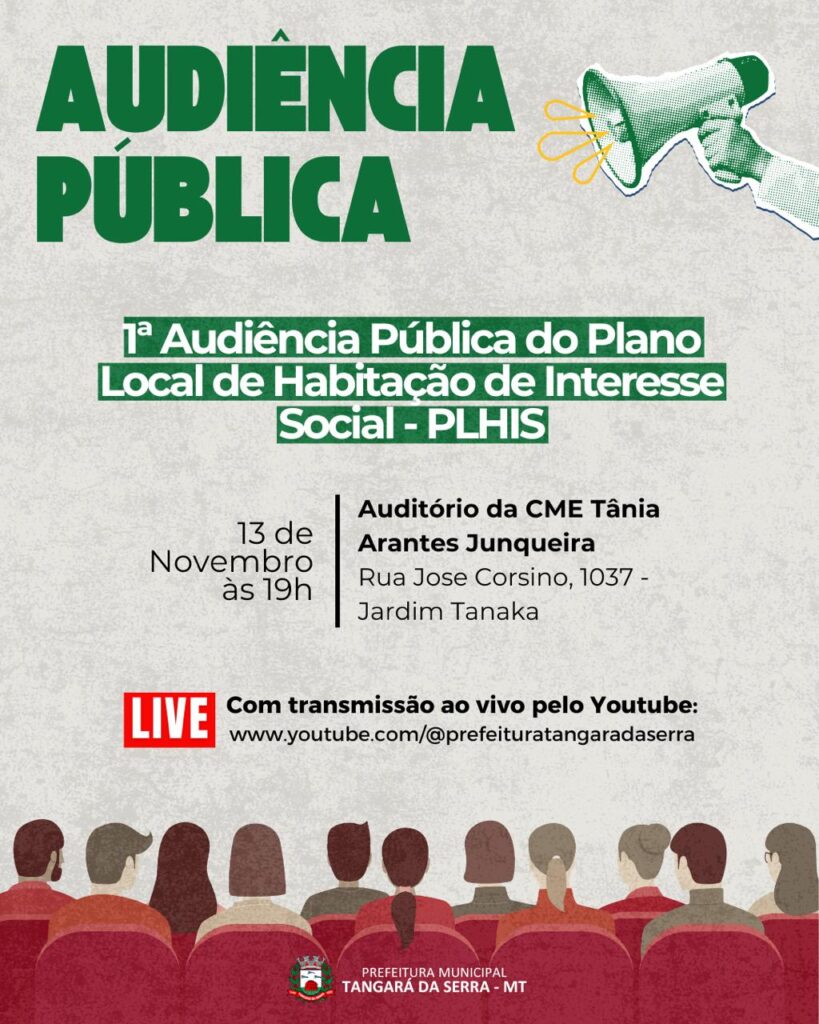 Como parte das etapas do plano, a Prefeitura convida toda a comunidade para participar da 1ª Audiência Pública do Plano Local de Habitação de Interesse Social, que será realizada hoje (13), às 19h, no Auditório da CME Tânia Arantes Junqueira, localizado na Rua José Corsino, nº 1037, bairro Jardim Tanaka.