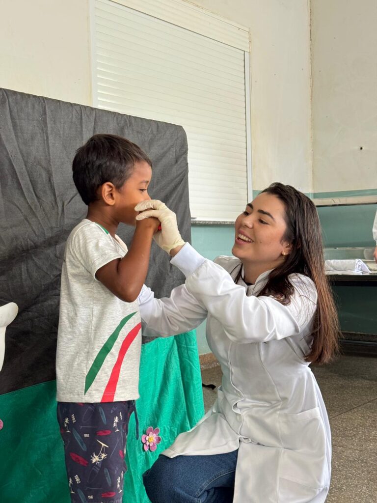 A equipe de odontologia levou até a escola um consultório portátil, possibilitando a avaliação imediata dos estudantes diretamente em sala de aula. A iniciativa ampliou o acesso ao atendimento odontológico e garantiu um cuidado mais próximo da realidade dos alunos da zona rural.