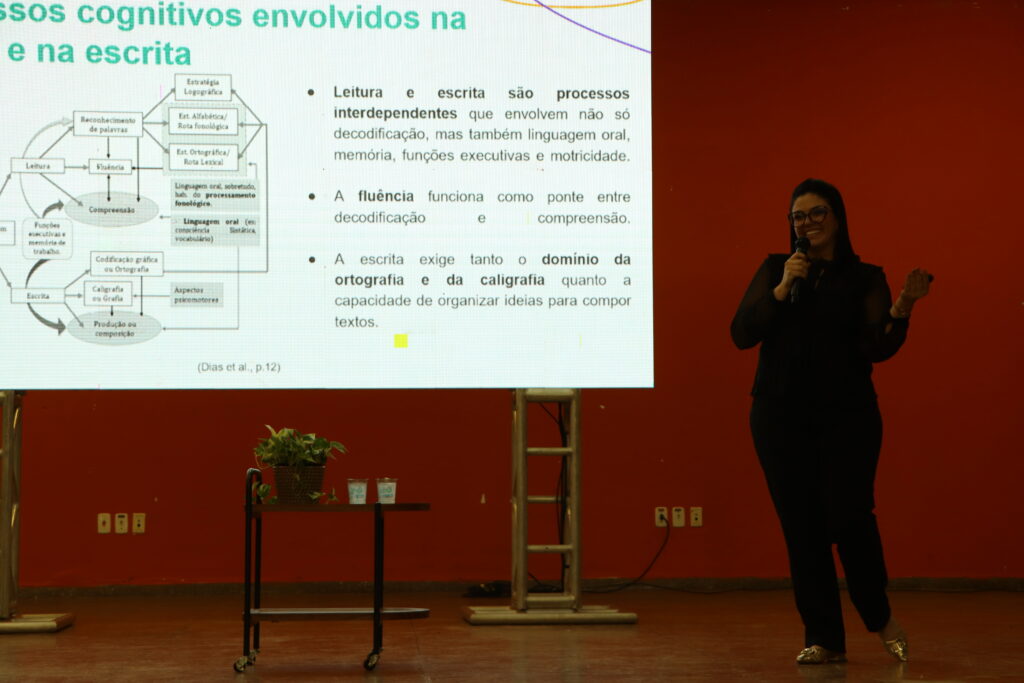 No período vespertino, a professora Doutora Christine Dias Gomes Araújo, referência em neuropsicologia infantil e coautora do Teste de Fluência de Leitura, ministrou a palestra magna sobre a centralidade da fluência como ponte entre decodificação e compreensão, apresentando estratégias aplicáveis ao cotidiano escolar, como leitura modelada, leitura repetida e leitura em pares, com foco em velocidade, precisão e prosódia.