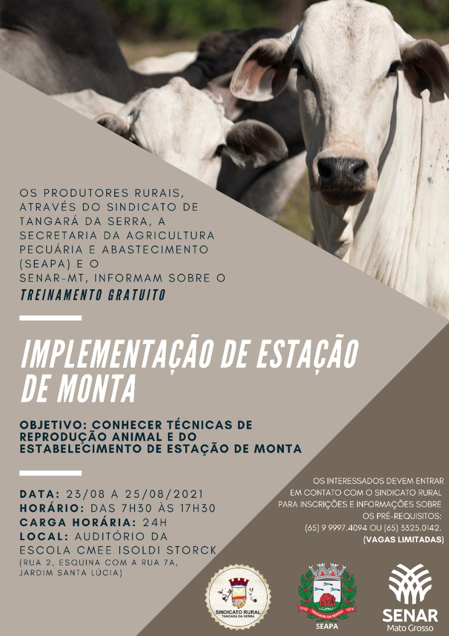 A Secretaria Municipal de Agricultura, Pecuária e Abastecimento, em parceria com o Sindicato Rural e o Serviço Nacional de Aprendizagem Rural (SENAR) oferecem treinamento gratuito em Tangará da Serra.
