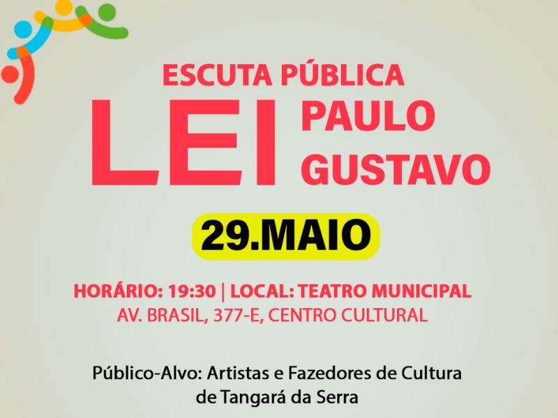 A Prefeitura de Tangará da Serra, por meio da Secretaria Municipal de Cultura e Turismo (SECULTUR), convida toda a classe artística (artistas de todas as áreas, grupos, associações, produtores culturais) para a Escuta Pública para a implementação da Lei Paulo Gustavo.