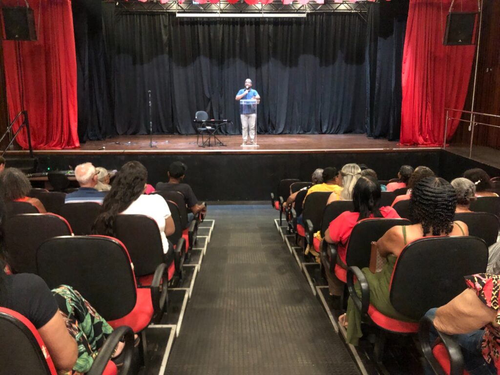 A Prefeitura Municipal, por meio da Secretaria de Assistência Social, transformou o teatro do Centro Cultural em um espaço de celebração e convivência no último dia 27 de março. O encontro reuniu idosos atendidos por diversas unidades do Centro de Referência de Assistência Social (CRAS) para marcar o encerramento das atividades do mês com foco na socialização e no fortalecimento de vínculos comunitários.